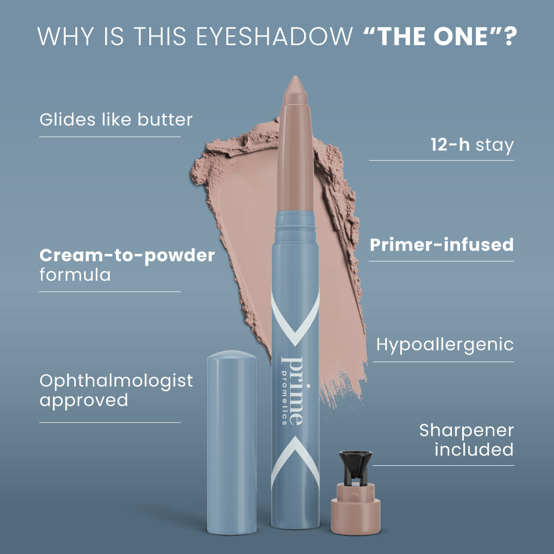PrimeEyes Eyeshadow: Buttery-soft matte with quick and silken application. Goes on like rich cream. Sets without budging -- for hours on end. Hypoallergenic, comfy-wear, waterline-friendly.