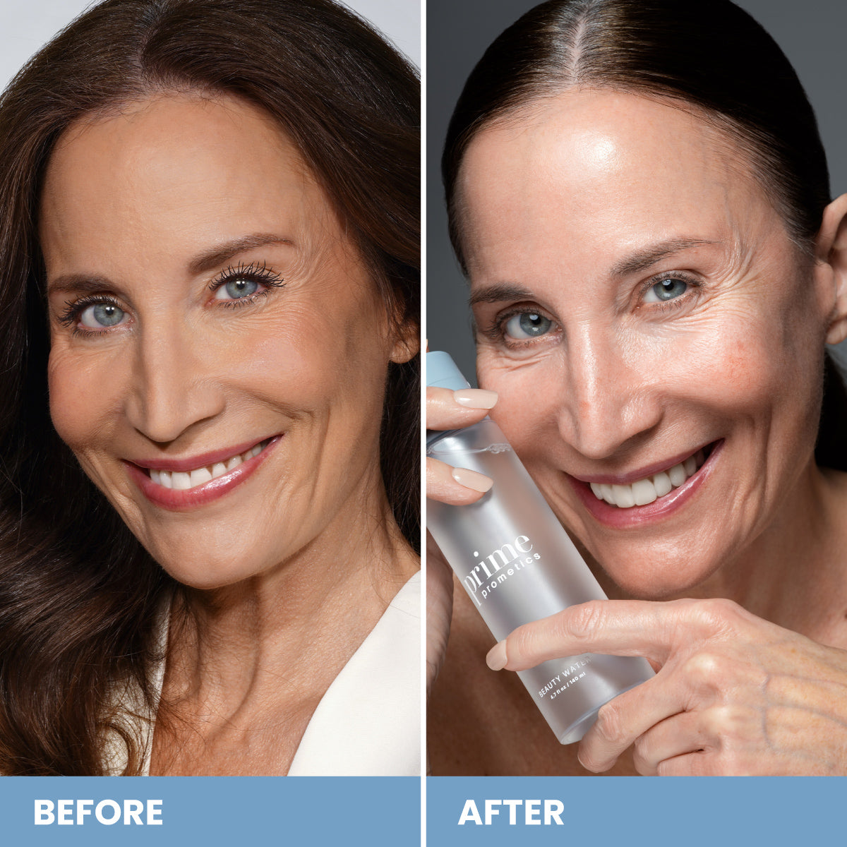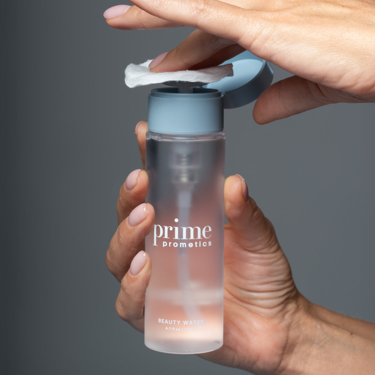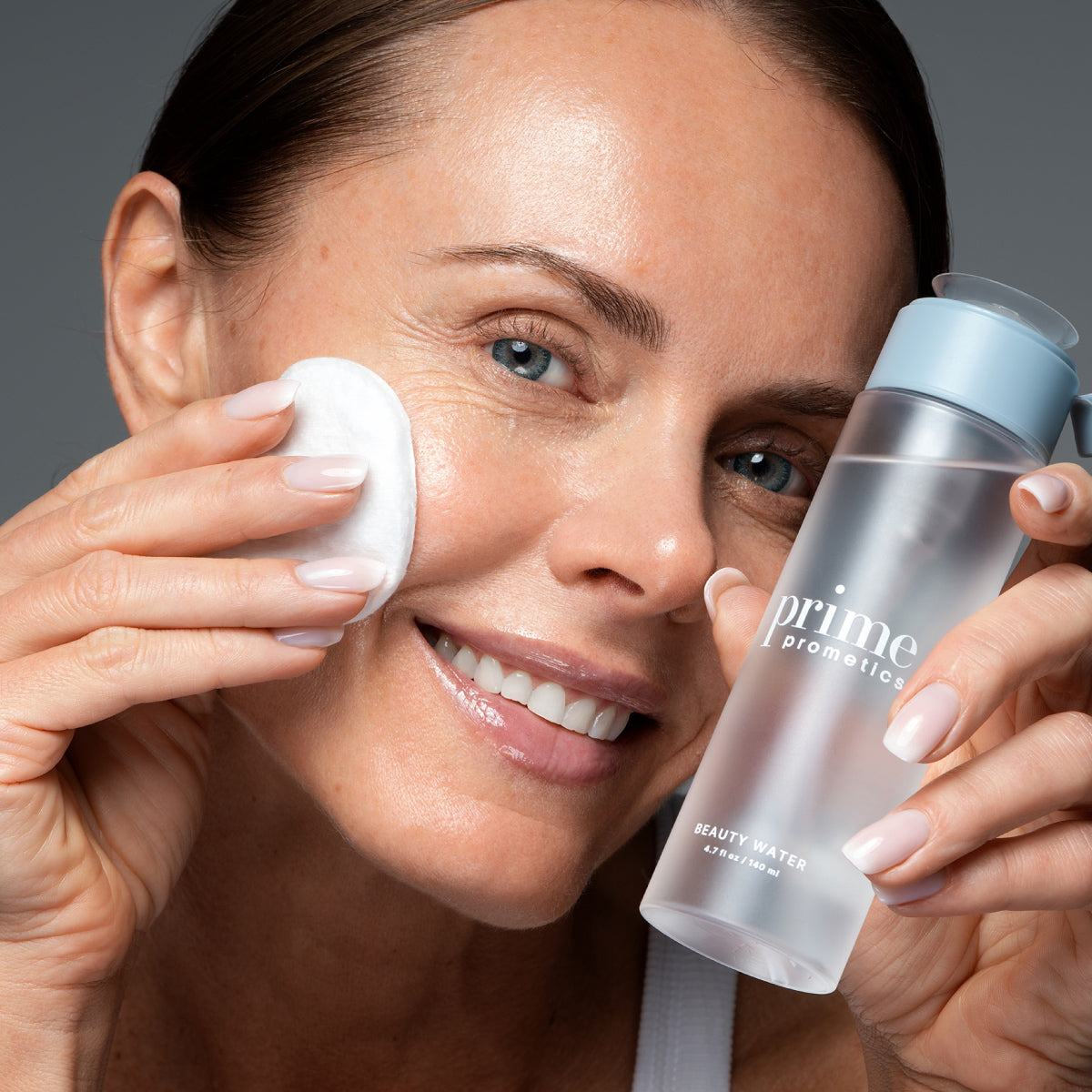 Prime Prometics Beauty Water is a no-rinse micellar cleanser for mature and sensitive skin that gently removes makeup, excess oil, and impurities without stripping or drying the skin.