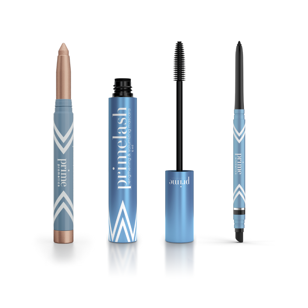 PrimeEyes Brightener, PrimeLash Mascara, and PrimeEyes Glide.