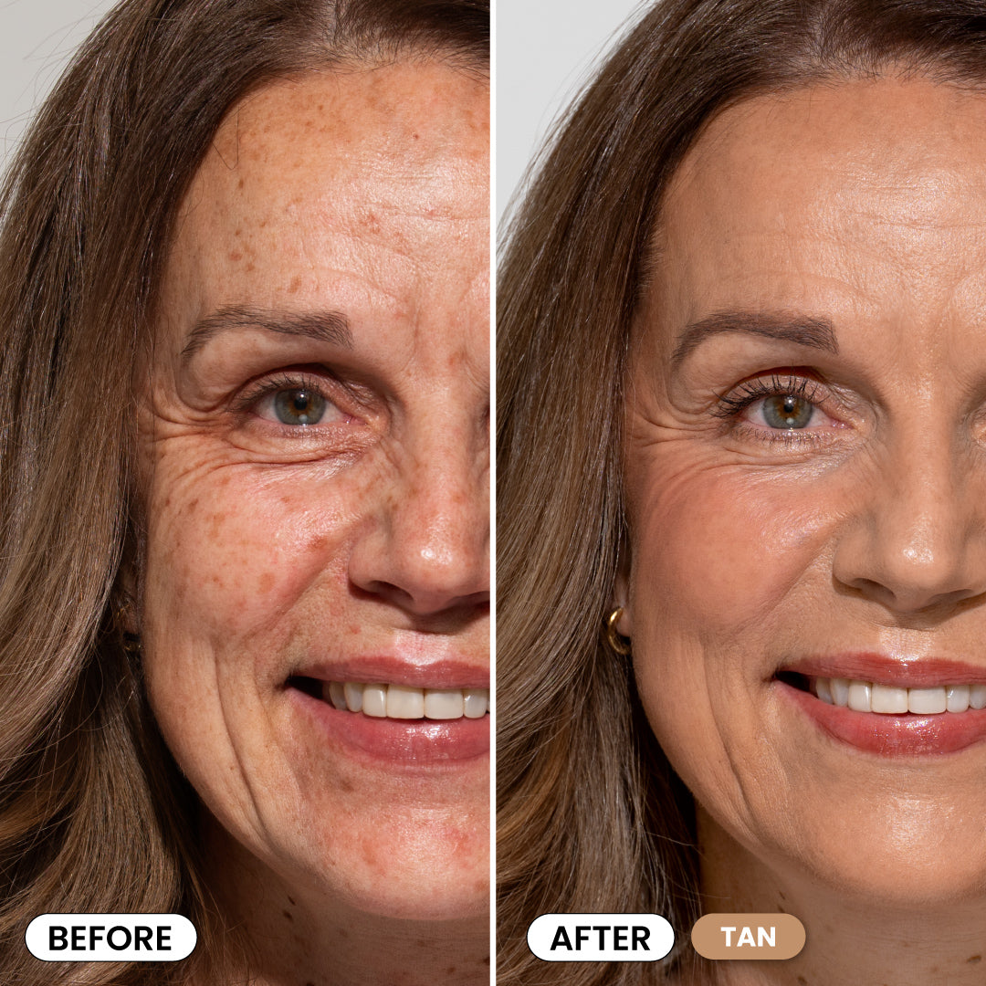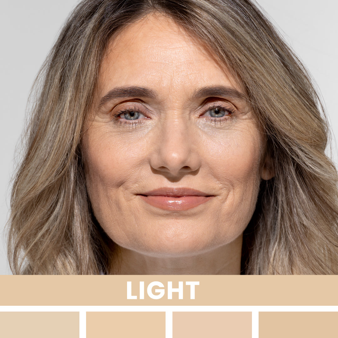 Lightweight foundation offers enough coverage to diminish age spots, neutralize redness, and blur pores, without settling into lines & wrinkles. Stays put, all day long!
