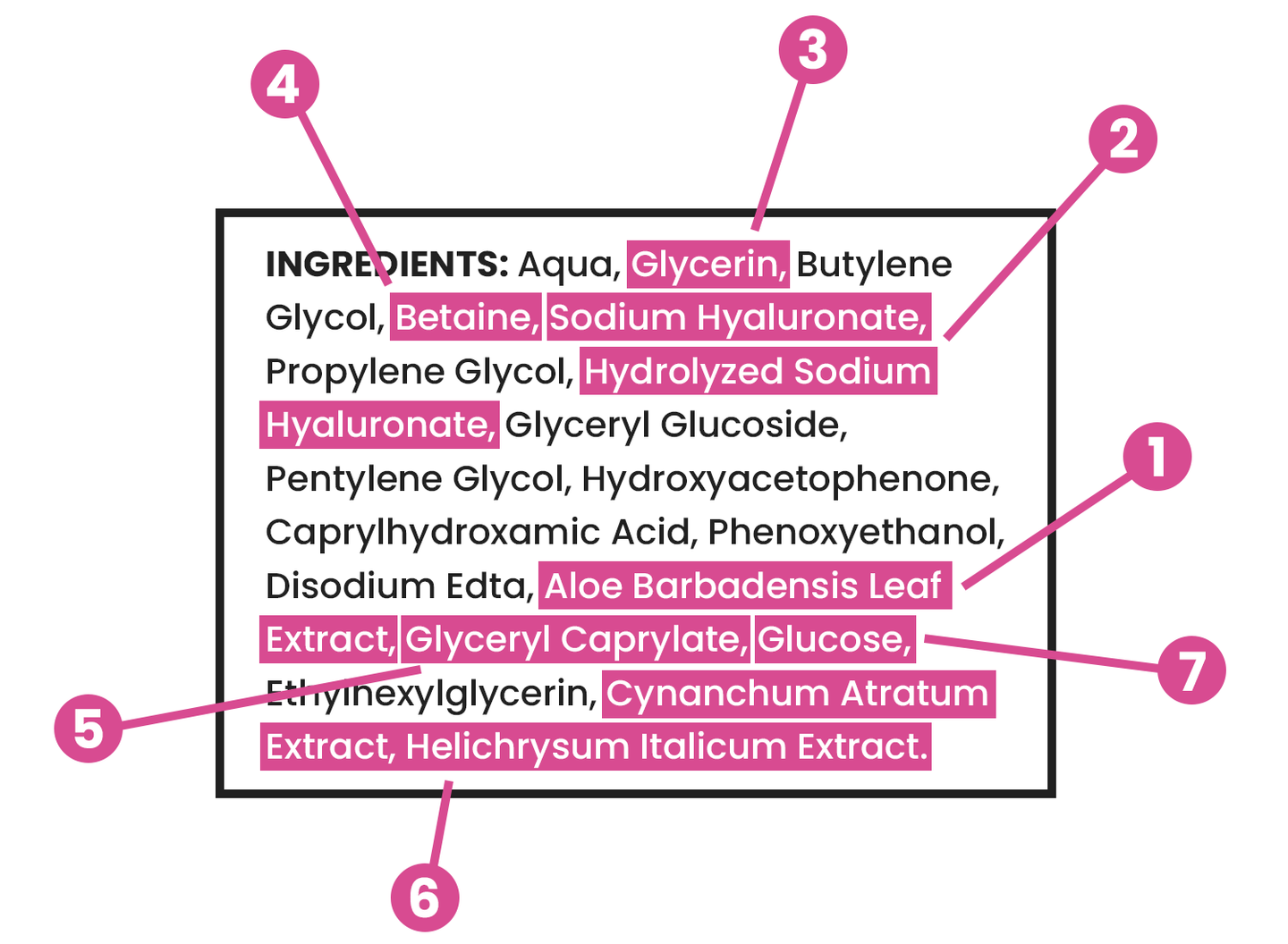 Aqua, Glycerin, Butylene Glycol, Betaine, Sodium Hyaluronate, Propylene Glycol, Hydrolyzed Sodium Hyaluronate, Glyceryl Glucoside, Pentylene Glycol, Hydroxyacetophenone, Caprylhydroxamic Acid, Phenoxyethanol, Disodium Edta, Aloe Barbadensis Leaf Extract, Glyceryl Caprylate, Glucose, Ethylhexylglycerin, Cynanchum Atratum Extract, Helichrysum Italicum Extract.